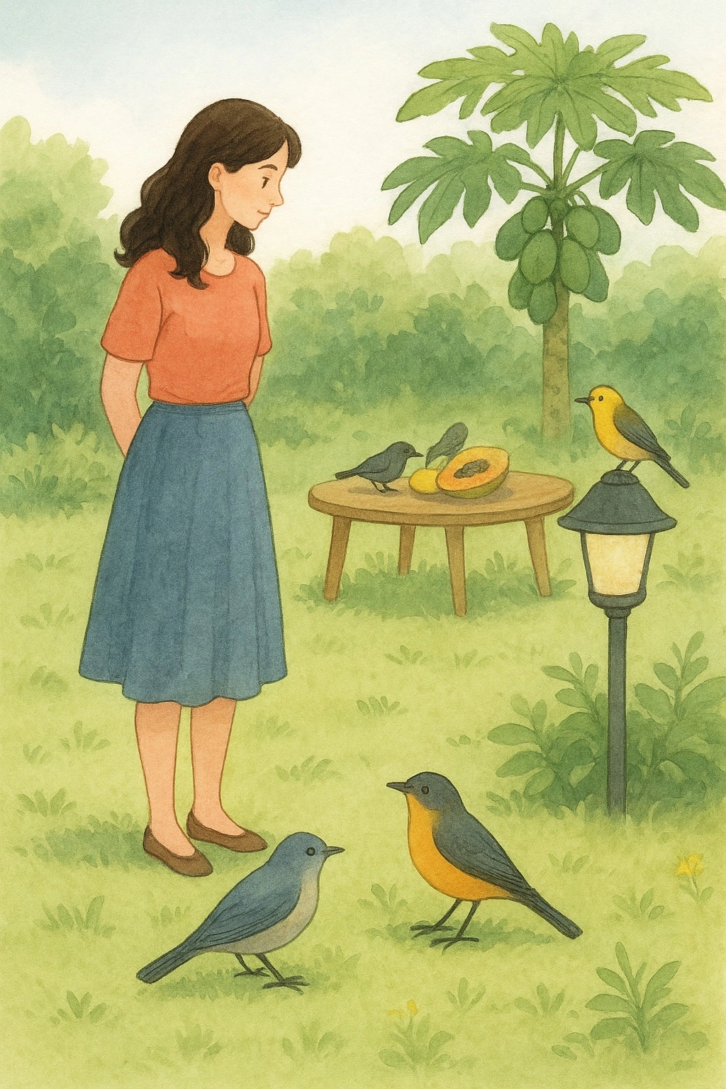 Logo a dona de casa apareceu com os farelos de milho, pedaços de pão e umas frutas. Colocou alguns sobre um pratinho que ficava estrategicamente colocado na mesa do jardim. Outros espalhou pelo chão. Afastou-se e ficou espiando ao longe. E eles vieram buscar o alimento reivindicado.