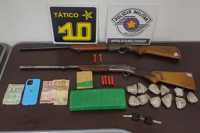 Em diligência, os policiais localizaram o veículo e realizaram a abordagem. Na busca pessoal e veicular, foram encontrados dinheiro, um celular, porções de entorpecentes, além de duas espingardas e munições. O suspeito informou ter obtido o material em um estabelecimento localizado na Avenida Raposo Tavares.
