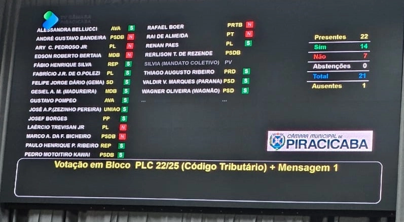 A Câmara Municipal de Piracicaba aprovou, por 14 votos favoráveis e sete contrários, o Projeto de Lei Complementar (PLC) 22/2025, de autoria do Executivo, que institui o novo Código Tributário do Município. A votação ocorreu durante a 31ª Reunião Extraordinária, realizada na manhã desta segunda-feira (29). Logo após, foi convocada e realizada a 32ª Reunião Extraordinária, para que o PLC fosse apreciado em segunda discussão, tornando-o apto a seguir para sanção do prefeito municipal.