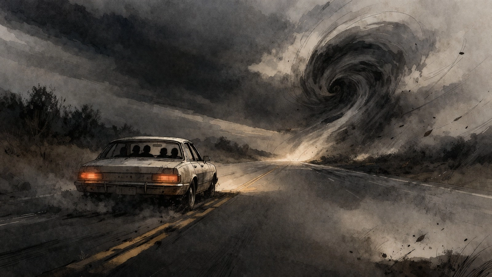Um heterogêneo grupo reunido em um carro viaja. Os motivos por hora são inexplicáveis. Coisas estranhas acontecem e eu vou tentar narrar fidedignamente os fatos. Eles percorrem uma estrada sombria, não sei dizer se era dia ou noite, mas o céu continha nuvens escuras. Ninguém conversava, o clima era tenso, não sei bem o porquê. O vento apresentava contornos assustadores até ganhar movimentos bruscos e circulares. A formação de um redemoinho gigante avança na estrada a frente vindo em sentido oposto ao carro, de frente, em sua direção, sem muita oportunidade de fuga.