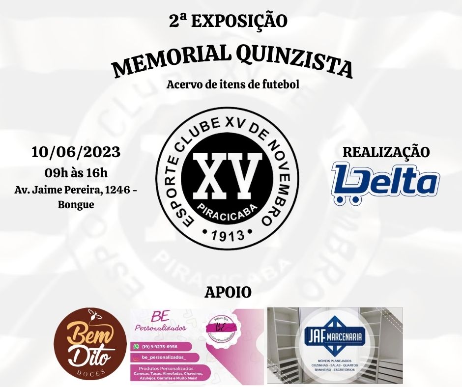 Nesse sábado, dia 10 de junho, das 9 às 16 horas, será realizado no Supermercado Delta, unidade do Bongue, uma exposição em homenagem ao E.C. XV de Novembro de Piracicaba. A iniciativa é de um pesquisador independente, o Zico. Em 2012, quando o advogado Luís Beltrame era presidente do XV, ele teve ideia de começar a organizar um memorial do clube e criou um espaço no Facebook, incluindo as peças que ia conseguido coletar sobre a memória do cube. Adepto também das estatísticas, passou a colecionar fichas técnicas dos jogos importantes do clube, bem ao estilo do que ensinaram fizeram o jornalista Rocha Neto e, mais recentemente, o radialista Mario Luiz, com seus livros sobre a história do clube. torcedor quinzista Ednilson do Carmo, o Zico, técnico em química e atualmente trabalhando como porteiro em edifício da cidade.