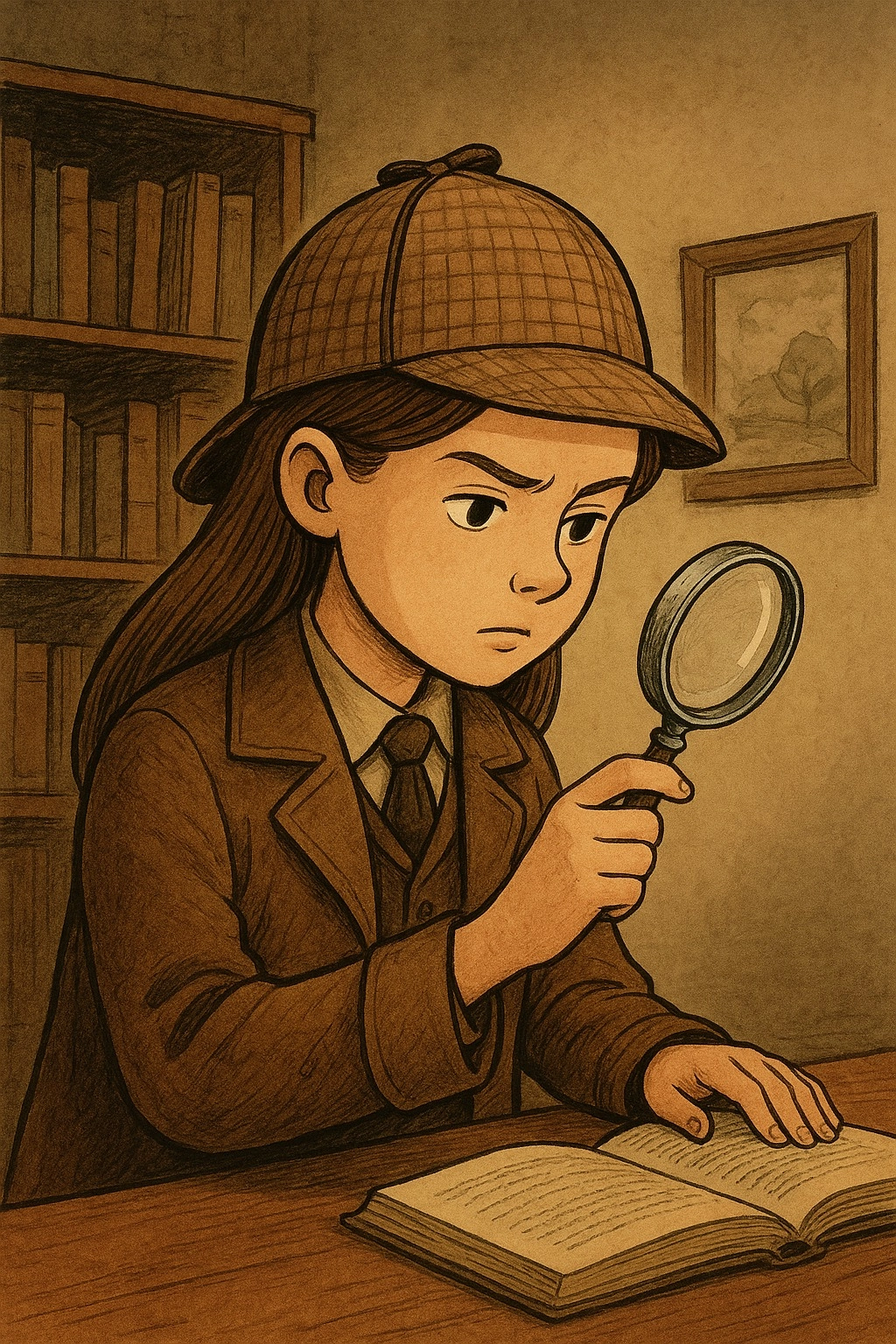 O pai queria acrescentar um cachimbo de verdade à fantasia para ficar mais completa, mas a mãe vetou, trocou por uma lupa, muito mais legal. Ela se divertiu muito! Uma das coisas que ela mais gostava era da literatura. Lia de tudo um pouco, e muito do que mais curtia, os livros de mistério. Leu muitas obras de Ágatha Christie e de outros autores conhecidos ou não.