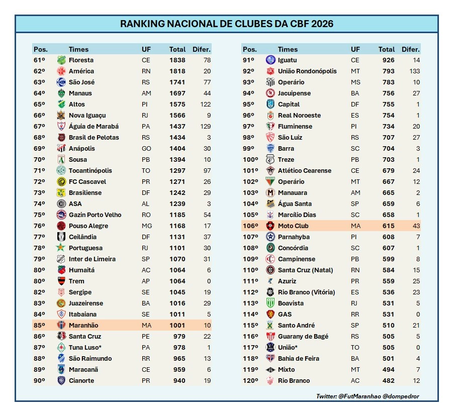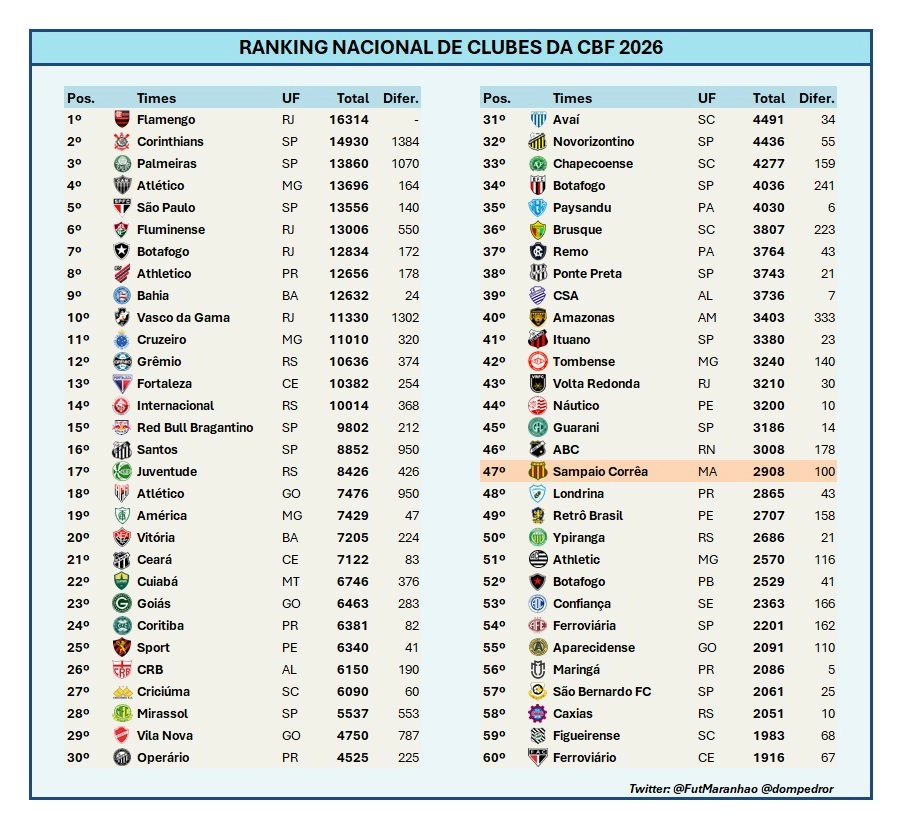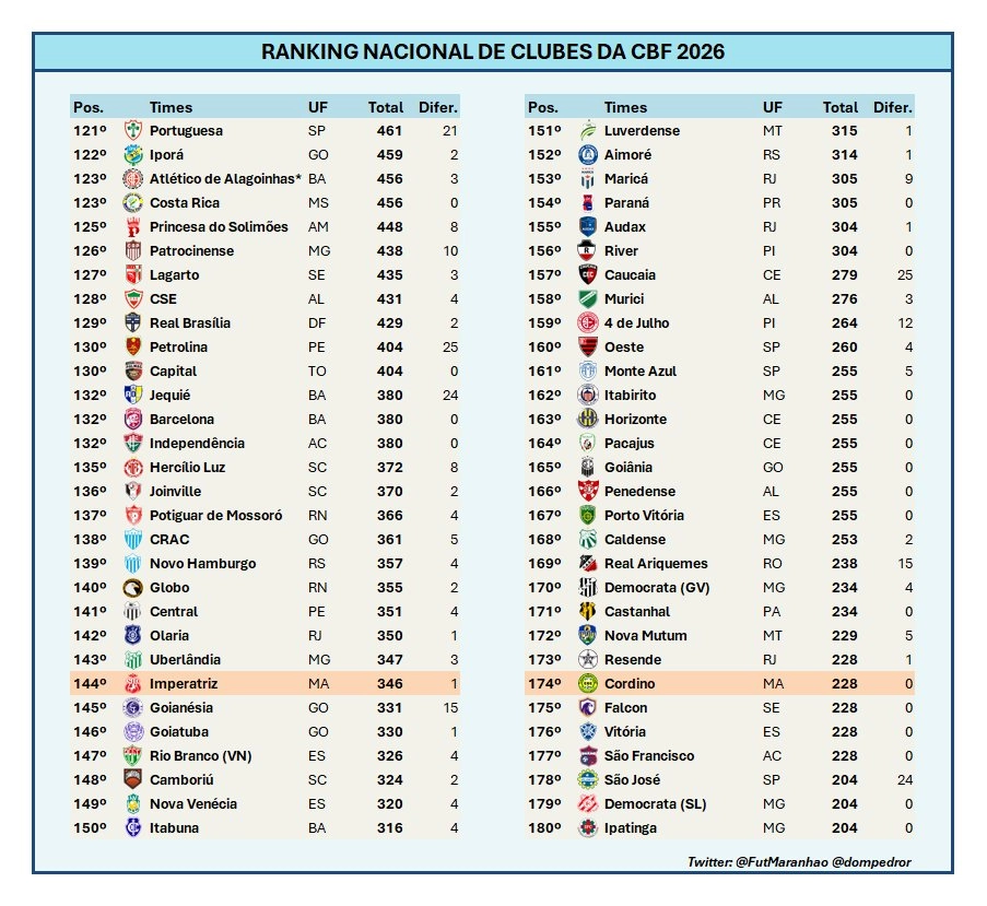 São 235 clubes, o XV de Piracicaba, campeão da Copa Paulista, ocupa a 189ª posição com 153 pontos.