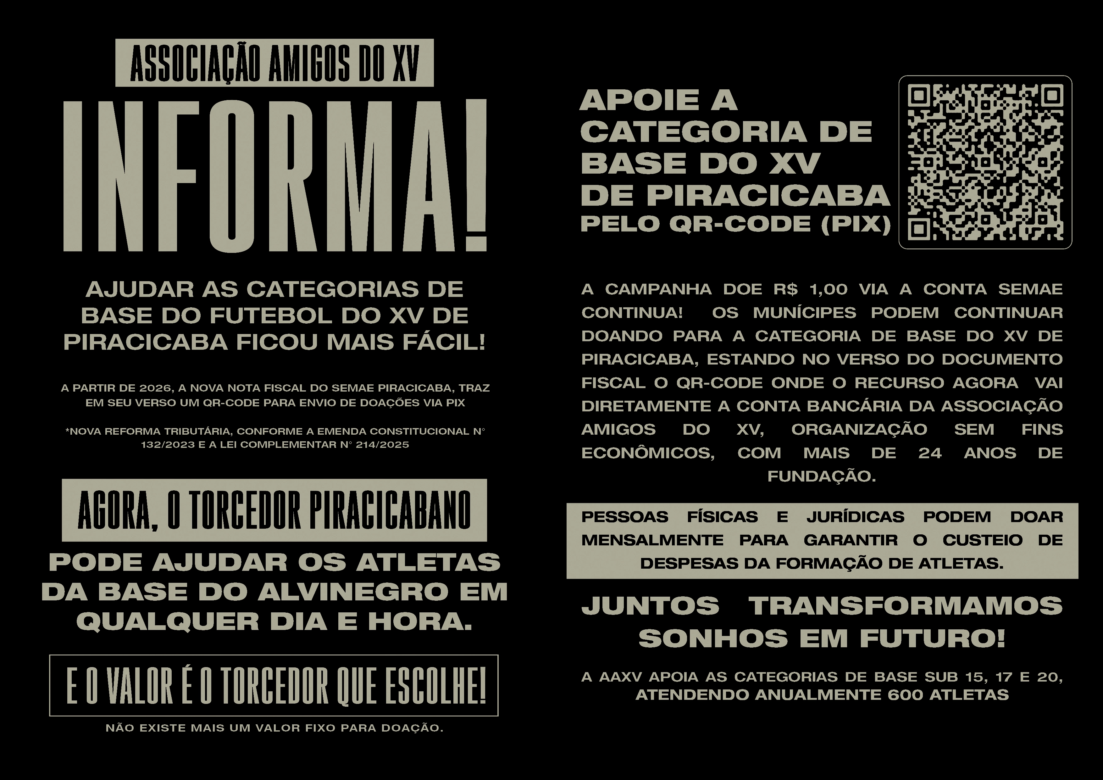 A Campanha Doe via a Conta SEMAE continua! Os munícipes podem continuar doando para a categoria de base do XV de Piracicaba, estando no verso do documento fiscal o QR-code onde o recurso agora vai diretamente a conta bancária da Associação Amigos do XV, organização sem fins econômicos, com mais de 24 anos de fundação.