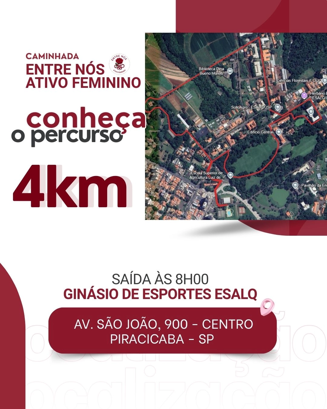 No dia 29 de março de 2026 (domingo), Piracicaba recebe a 1ª edição da Caminhada Entre Nós – Ativo Feminino, um evento pensado para promover conexão, bem-estar e convivência. A atividade acontece a partir das 7h, com saída às 8h, no Ginásio de Esportes da ESALQ/USP, com um percurso de aproximadamente 4 km.