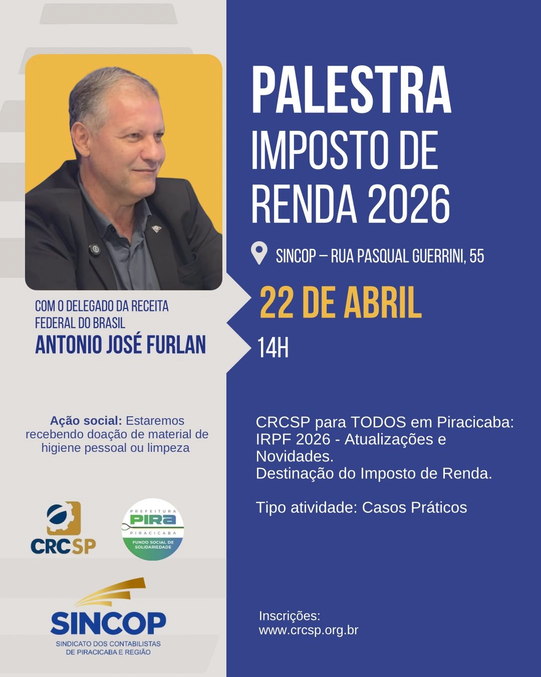 Com o tema “IRPF 2026 – Atualizações e Novidades. Destinação do Imposto de Renda”, a palestra tem apoio do Fundo Social de Solidariedade e será ministrada pelo delegado da Receita Federal do Brasil em Piracicaba, Antonio José Furlan. A atividade integra o programa “CRCSP para Todos” do CRC - Conselho Regional de Contabilidade do Estado de São Paulo e contará com abordagem prática, trazendo orientações relevantes para o dia a dia dos profissionais da contabilidade. O evento tem pontuação válida para o Programa de Educação Profissional Continuada, importante para a atualização e regularidade dos profissionais da área.