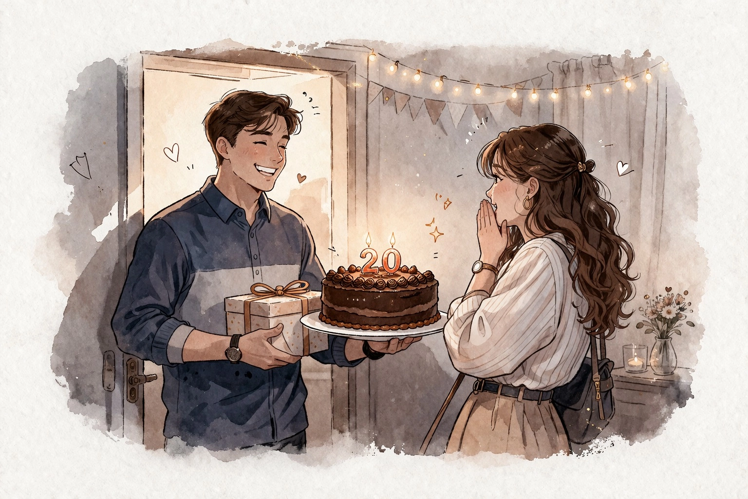 Ele chegou todo arrumado e perfumado. Trazia nas mãos um presente embrulhado e um lindo bolo todo confeitado de chocolate com duas velinhas em cima indicando o número 20.